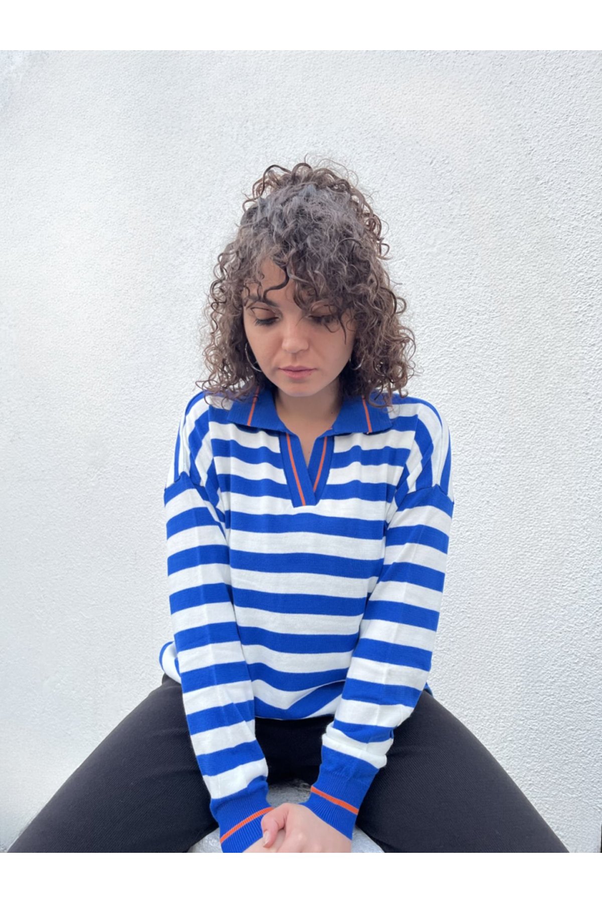 Çizgili Gömlek Yaka Triko Kazak Saks Mavisi