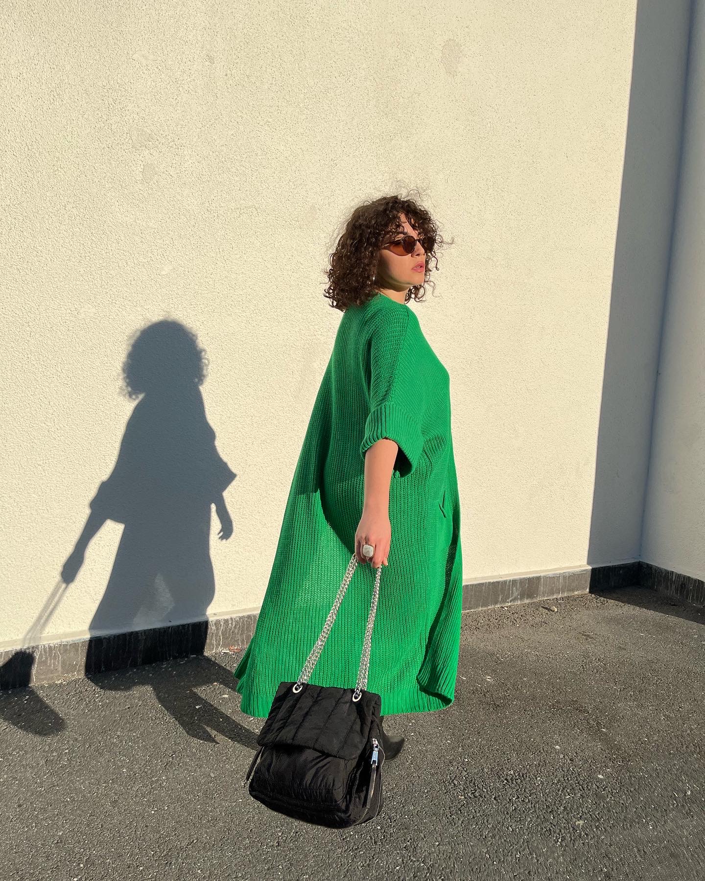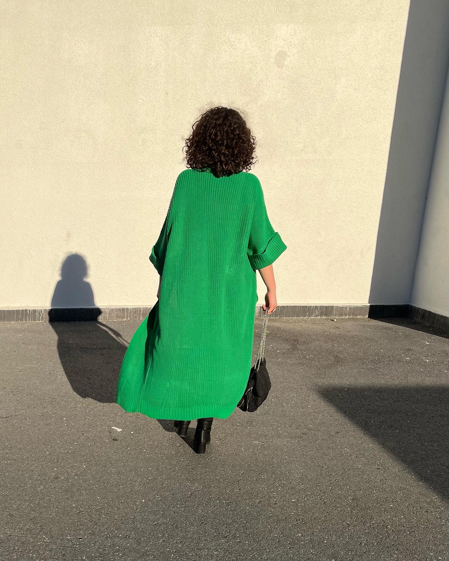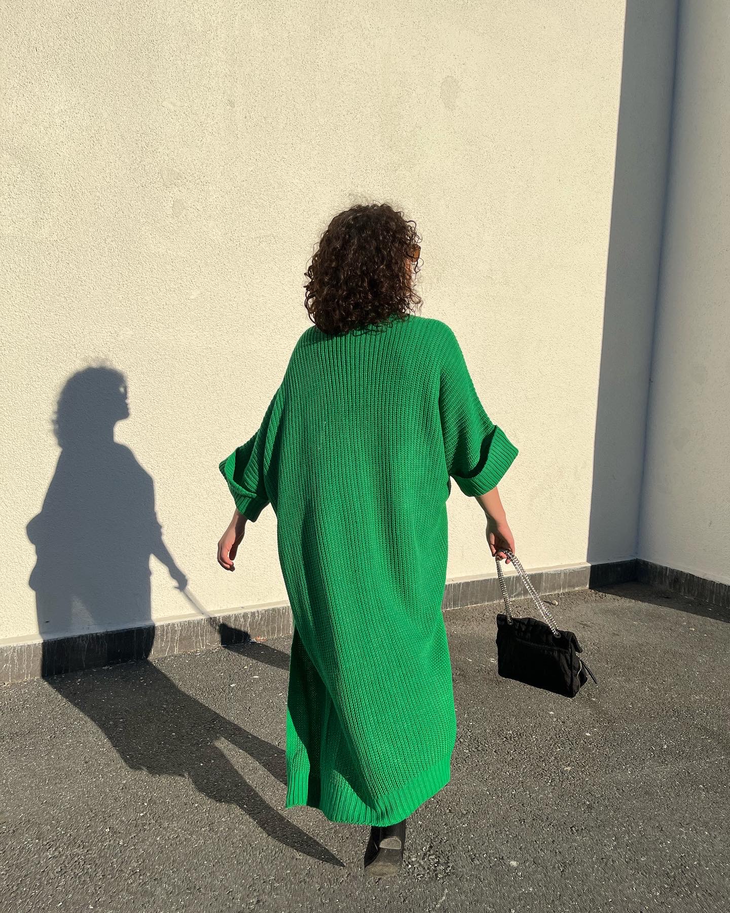 Dirsek Kol Yeşil Triko Uzun Hırka