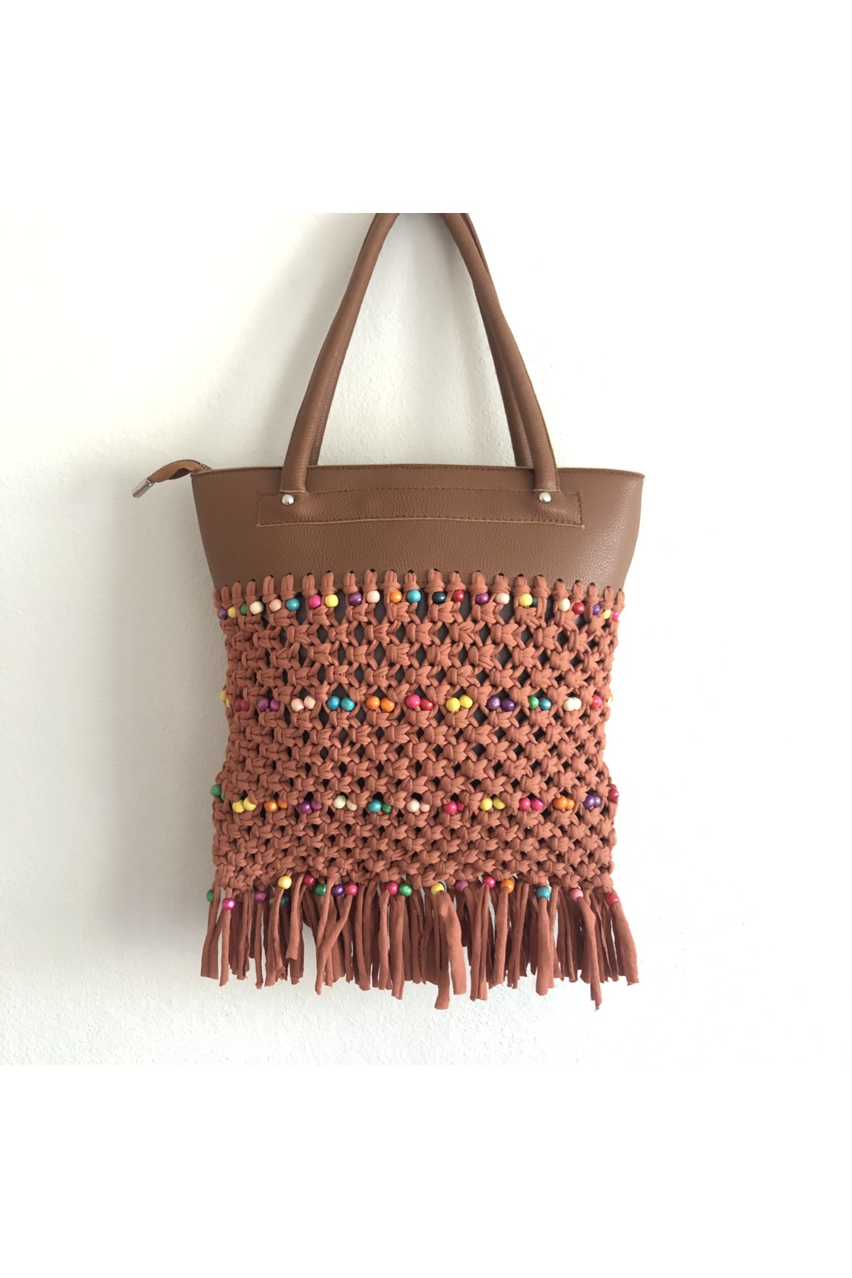 El Yapımı Penye Boncuk Detay Astarlı Çanta Kahverengi
