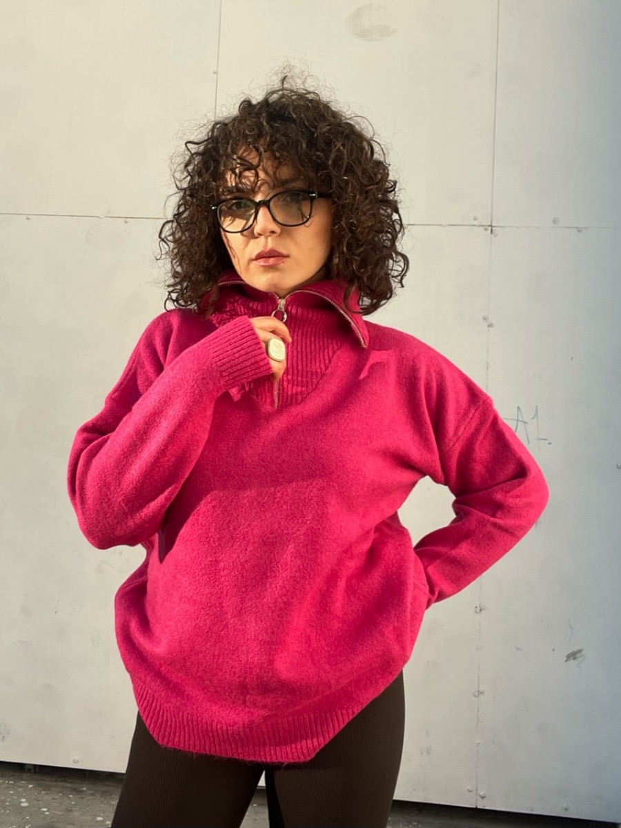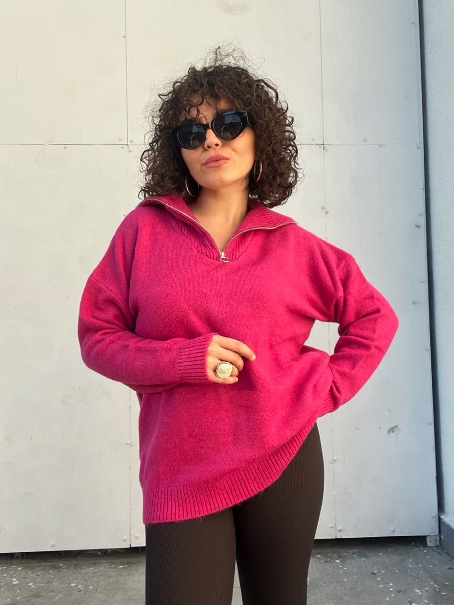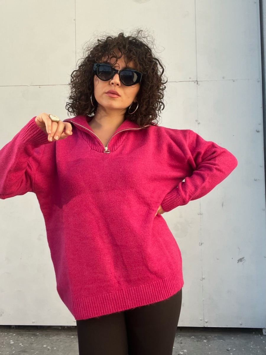 Fermuarlı Dik Yaka Pembe Triko Kazak