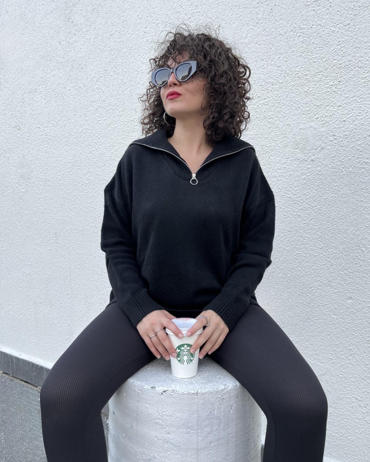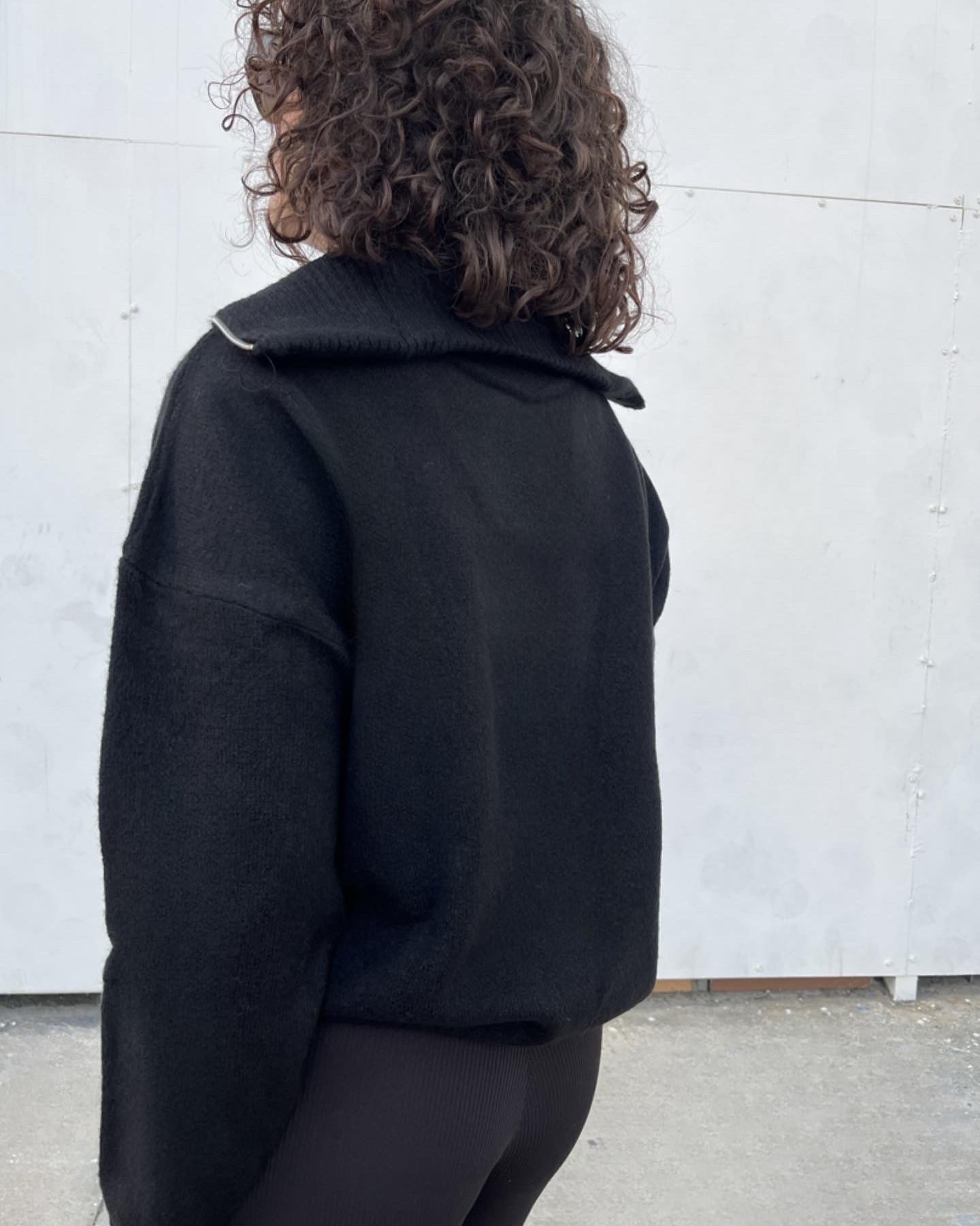 Fermuarlı Dik Yaka Siyah Triko Kazak