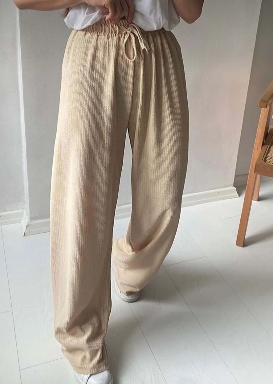 Gofre Kumaş Beli Lastikli Bol Paça Pantolon Bej