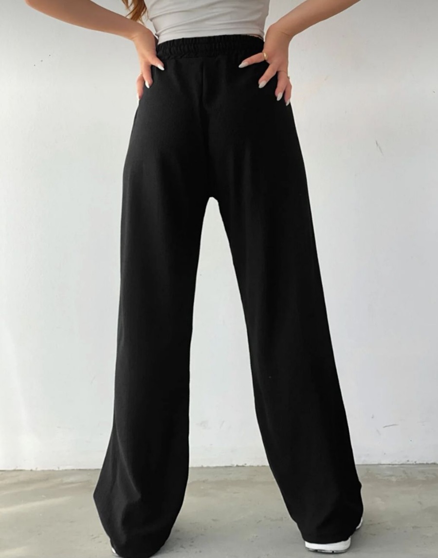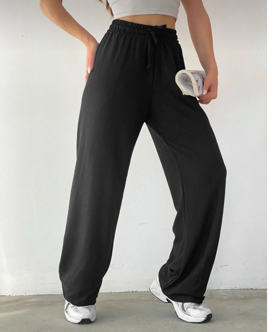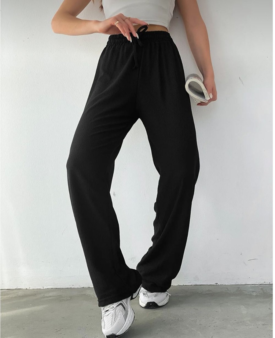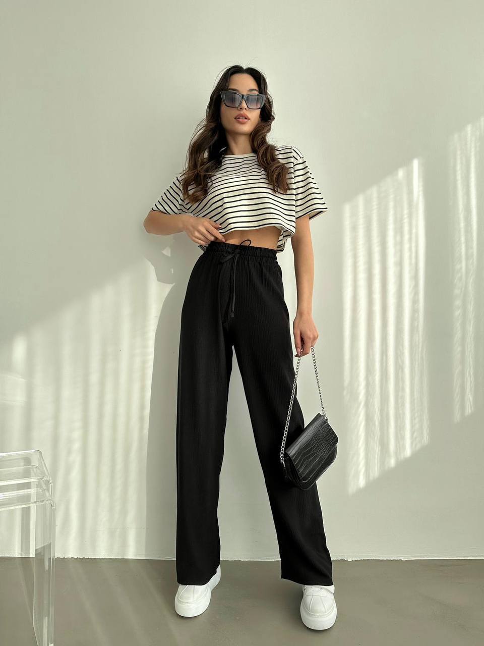Gofre Kumaş Beli Lastikli Bol Paça Pantolon Siyah